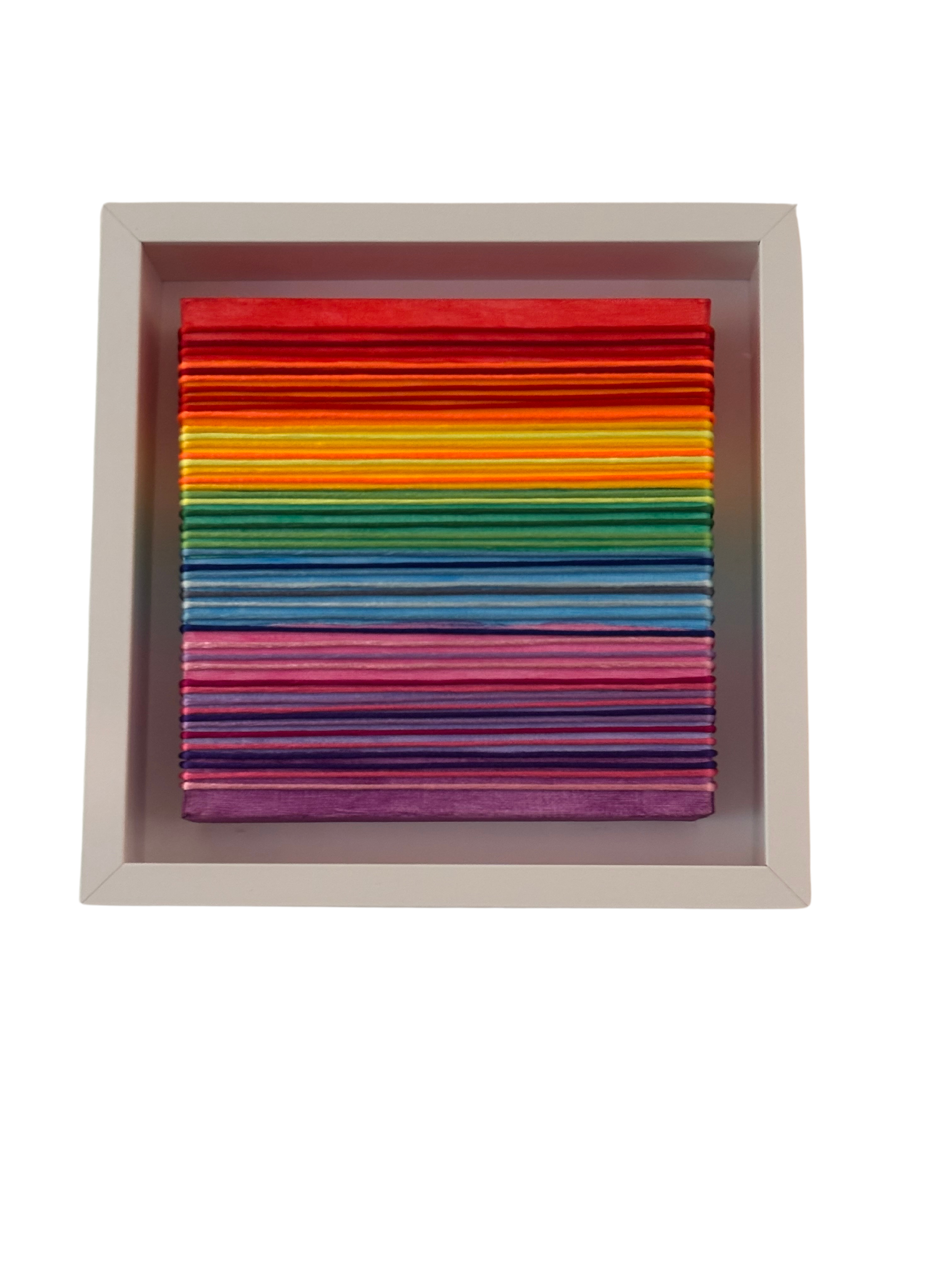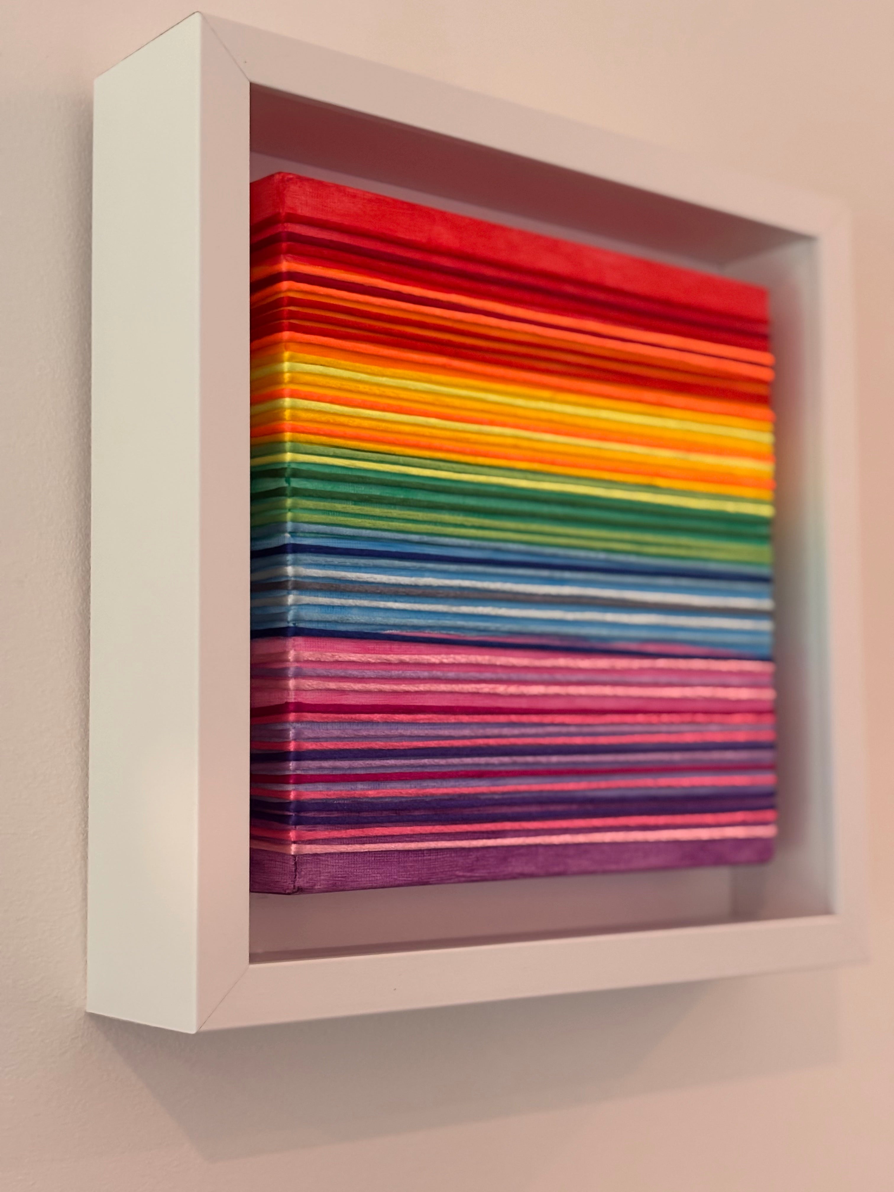 Acrylic on canvas, layered silk cords in different colors. Handmade and framed in a sleek design, ready to enrich your interior. Perfect as an eye-catcher in your living room, office or creative space.